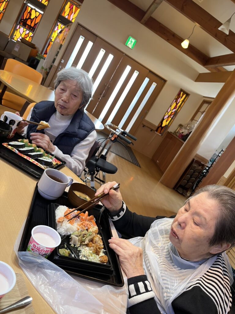 それぞれ選んだお弁当を共有スペースで食べました。場所が違うだけでも、なんだか特別感はありますね‼️