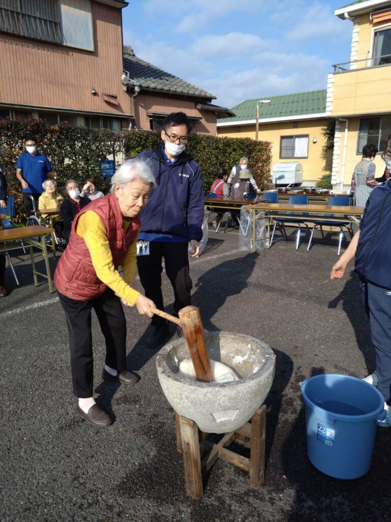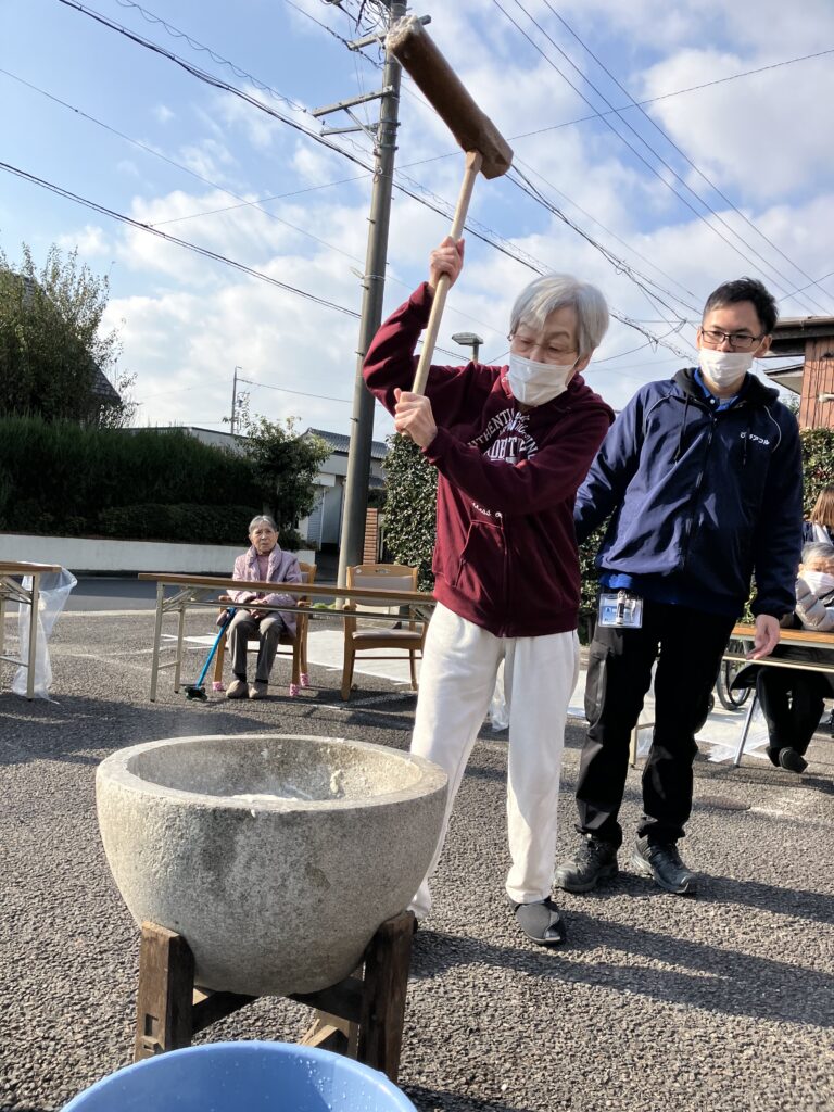 ホーム長も力いっぱいお餅をついてくれました。 皆さん頑張ってお餅をついてくれてます。