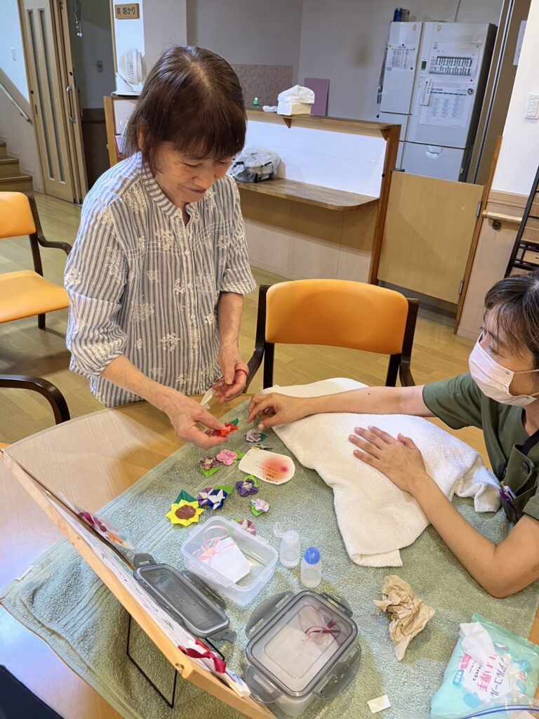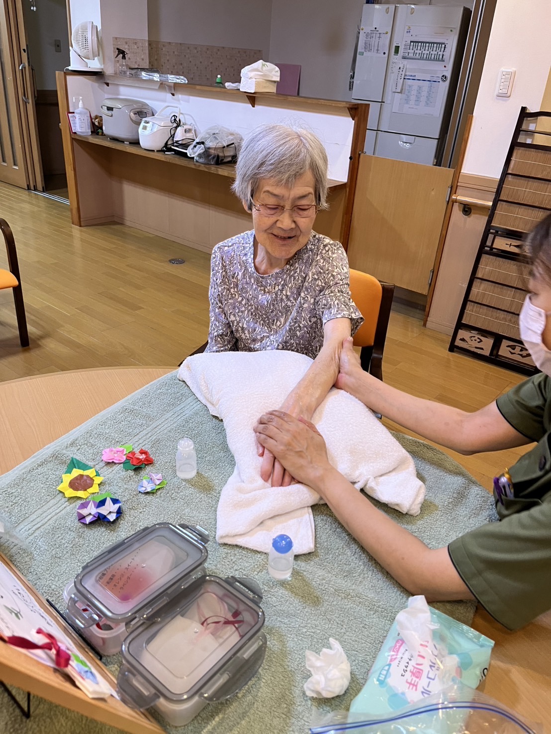 昨日はハンドマッサージをしてもらいました。チアフル訪問看護師が、ハンドマッサージをしてくれました。アロマを使って、リラックスしながら皆さん楽しんでいました。