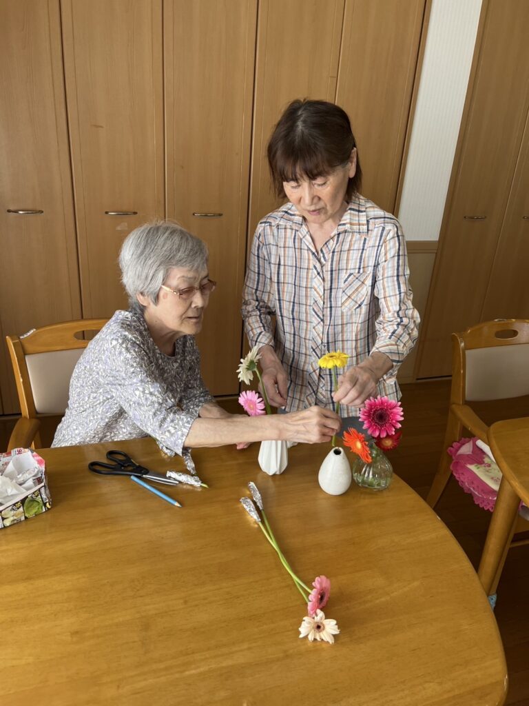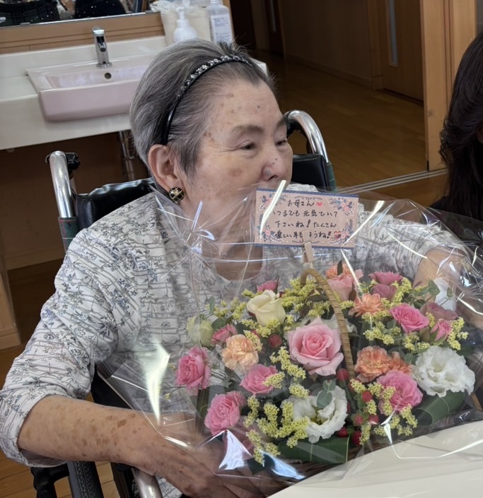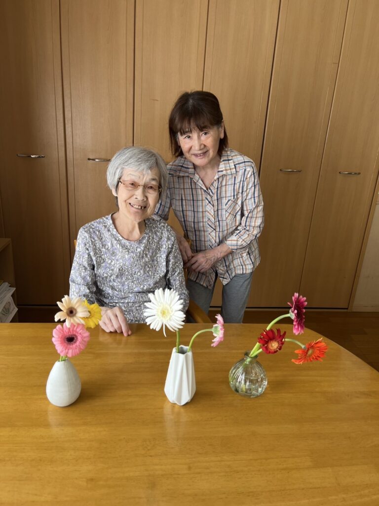ご家族様から他の利用者様にも、一輪ずつお花をプレゼントしてもらい皆さんとっても喜ばれていました。フロアに飾らせてもらいました。毎日綺麗なお花を見て過ごしています。ありがとうございます。皆さんこれからも元気に長生きして下さいね😆