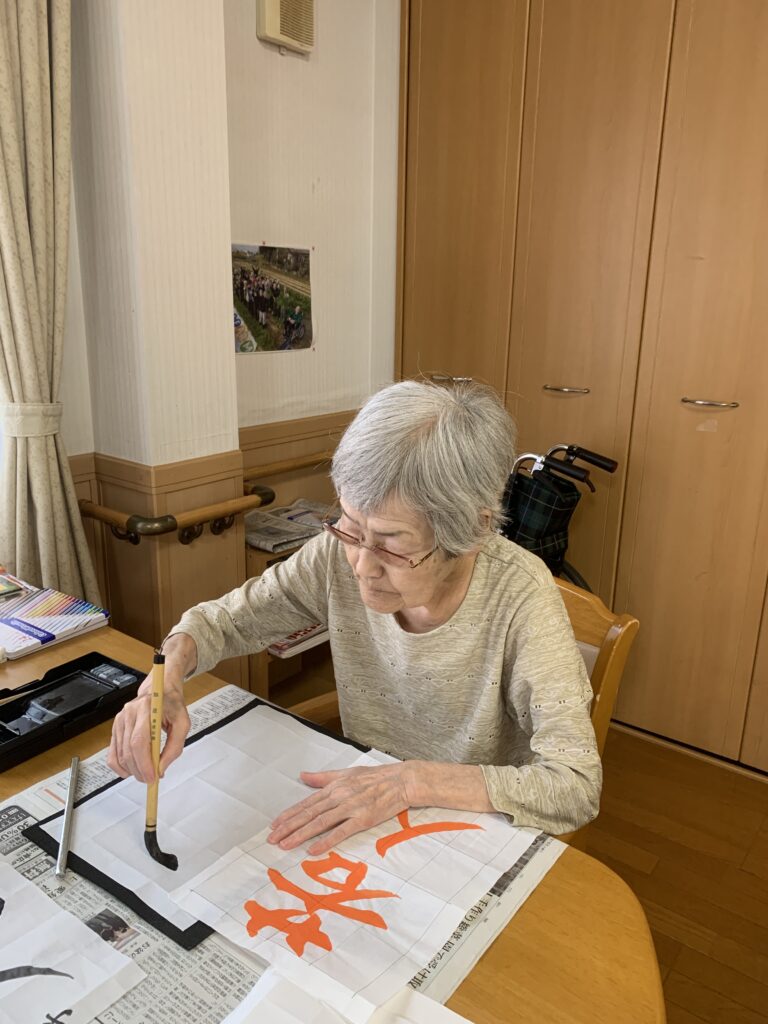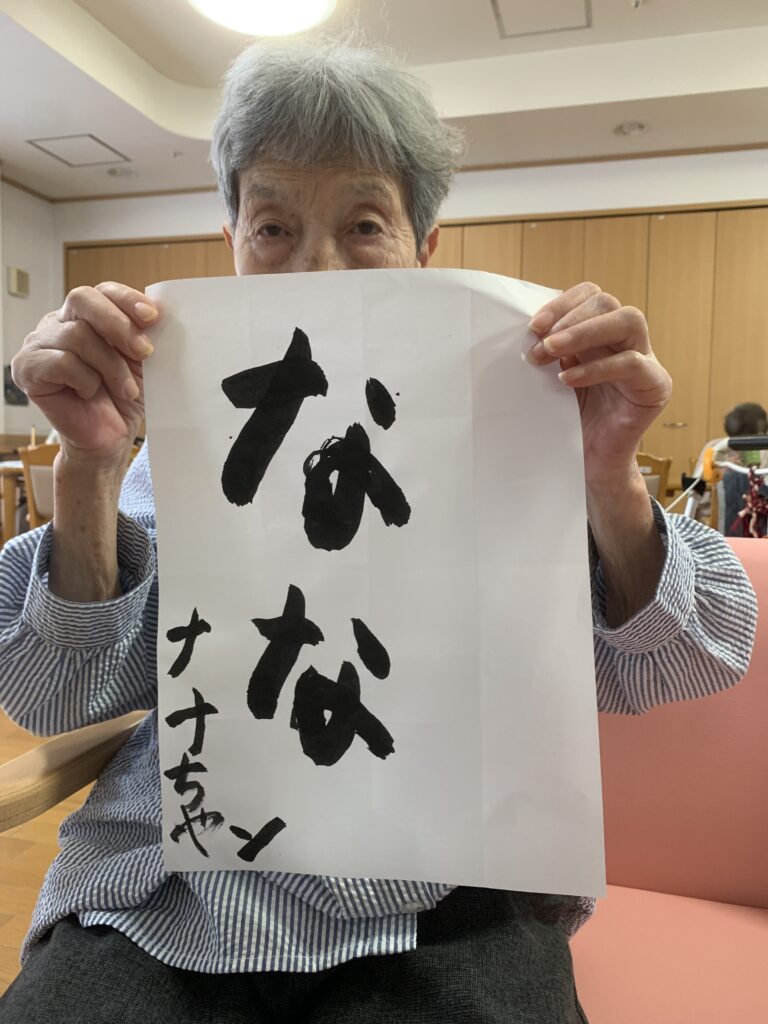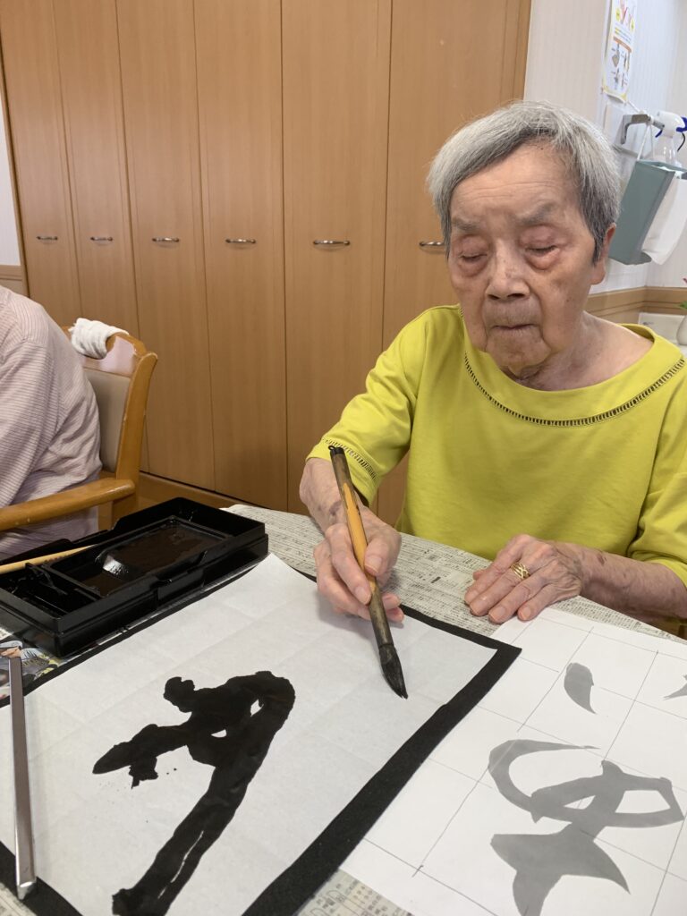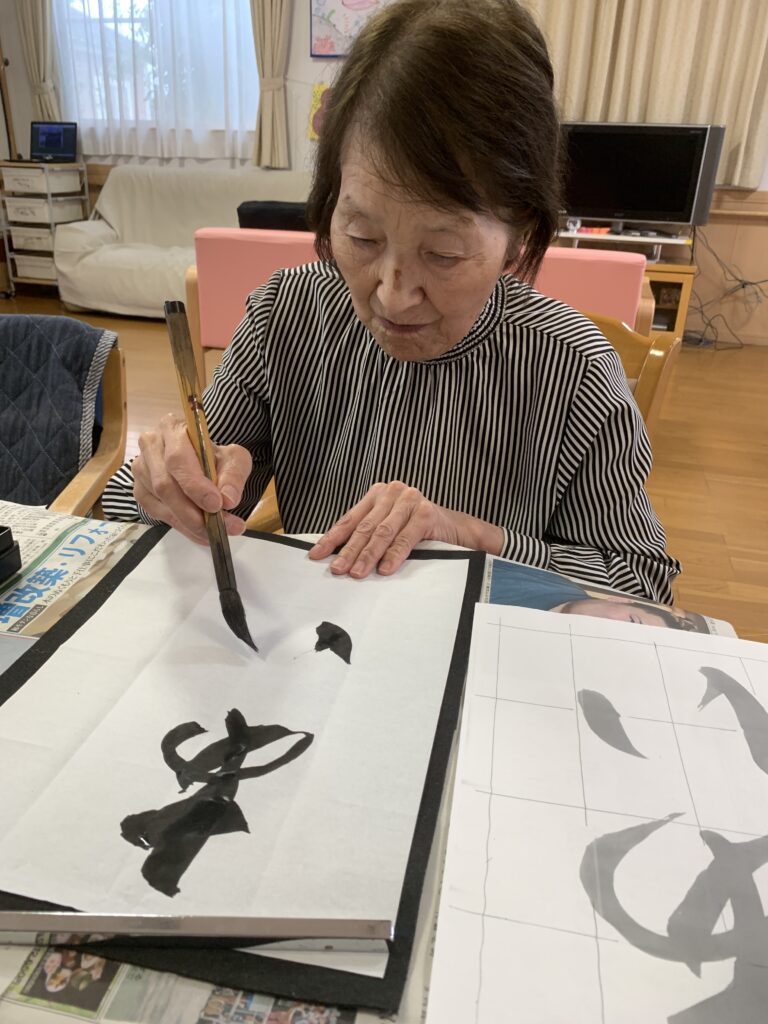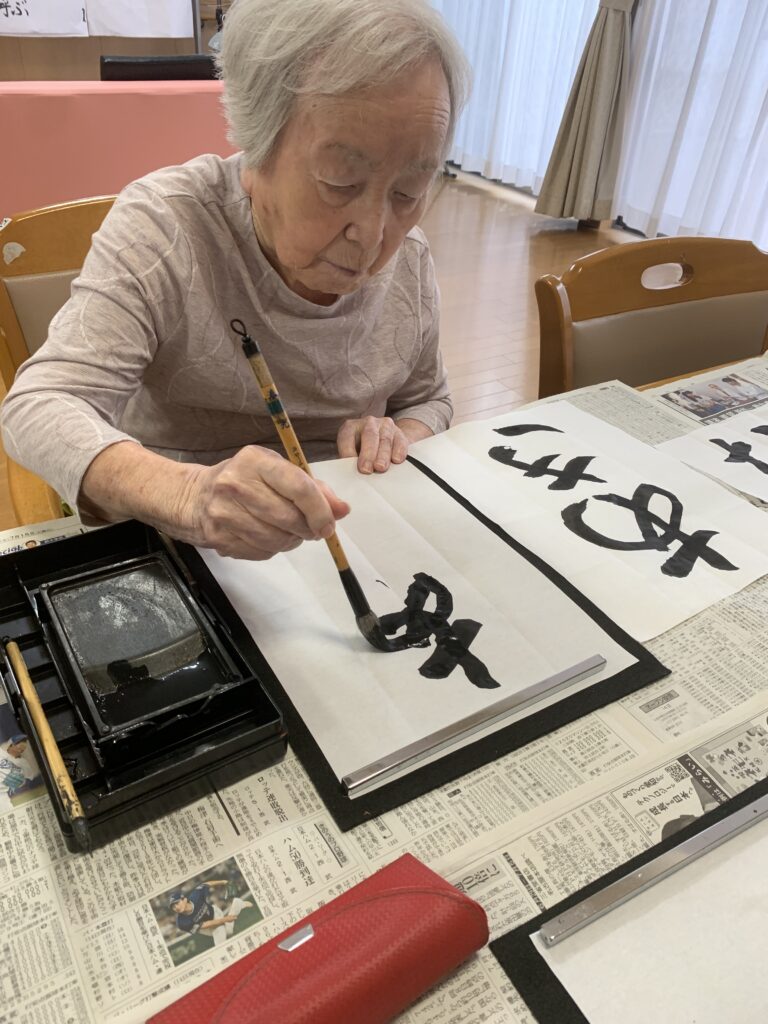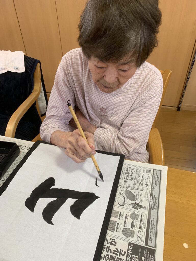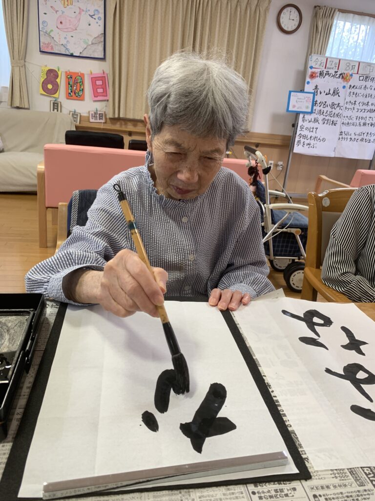 室内で皆さんと何をしようかな?と考えていると、以前「習字をやりたい」とのリクエストをもらったので習字教室を開催しました。