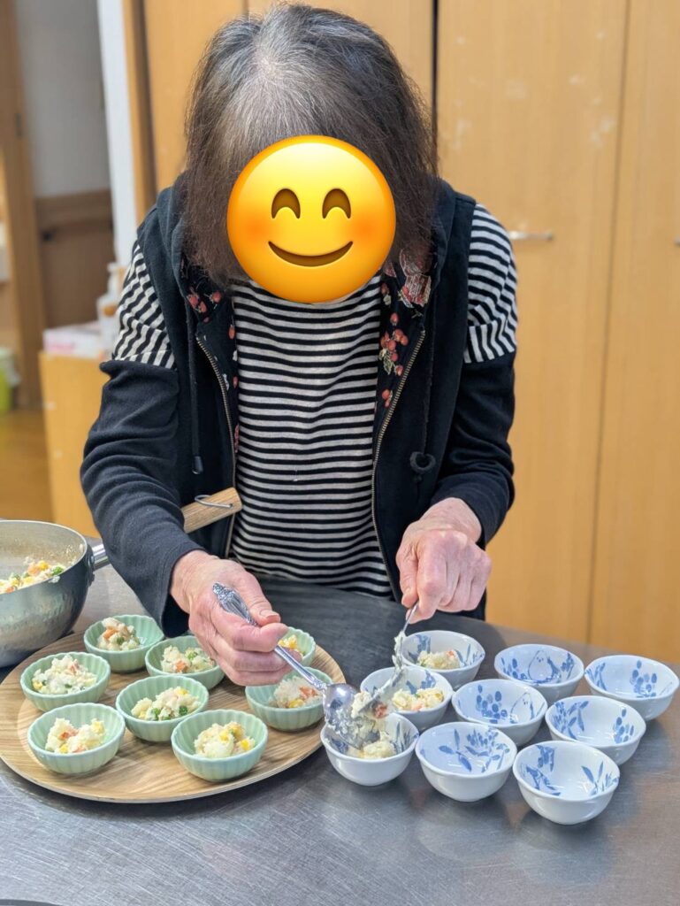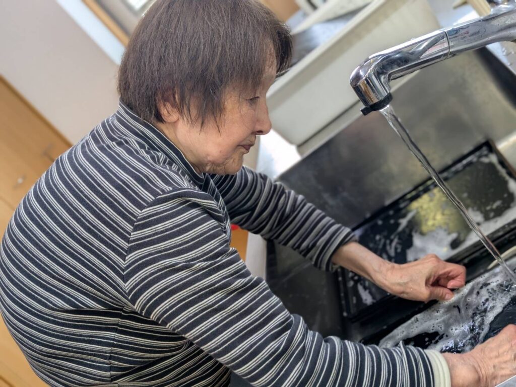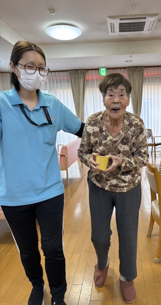 この日は調子も良く、カップを運んでくれました。自分で出来ることはやってもらう事を大切にしています。ご本人のペースで、スタッフも寄り添いながら😊