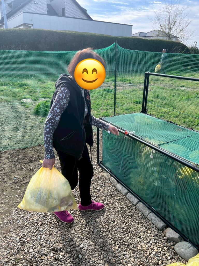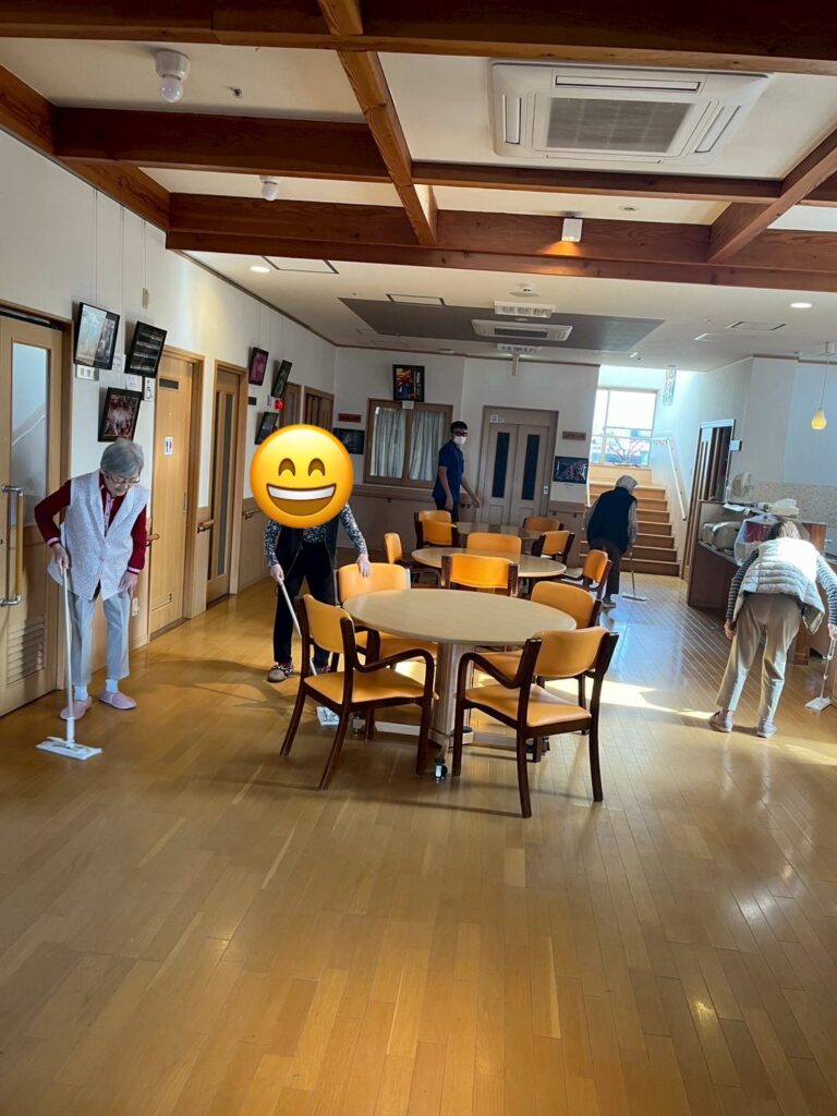 皆んなでお掃除やゴミ捨て、協力して行います。筋力アップの為、色々とお手伝いしてもらっています。