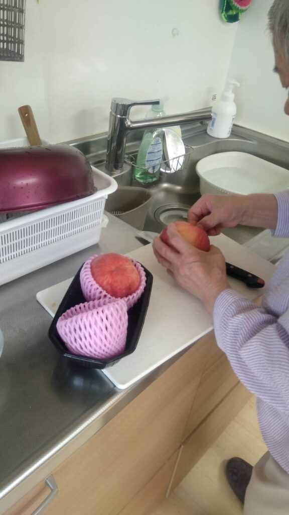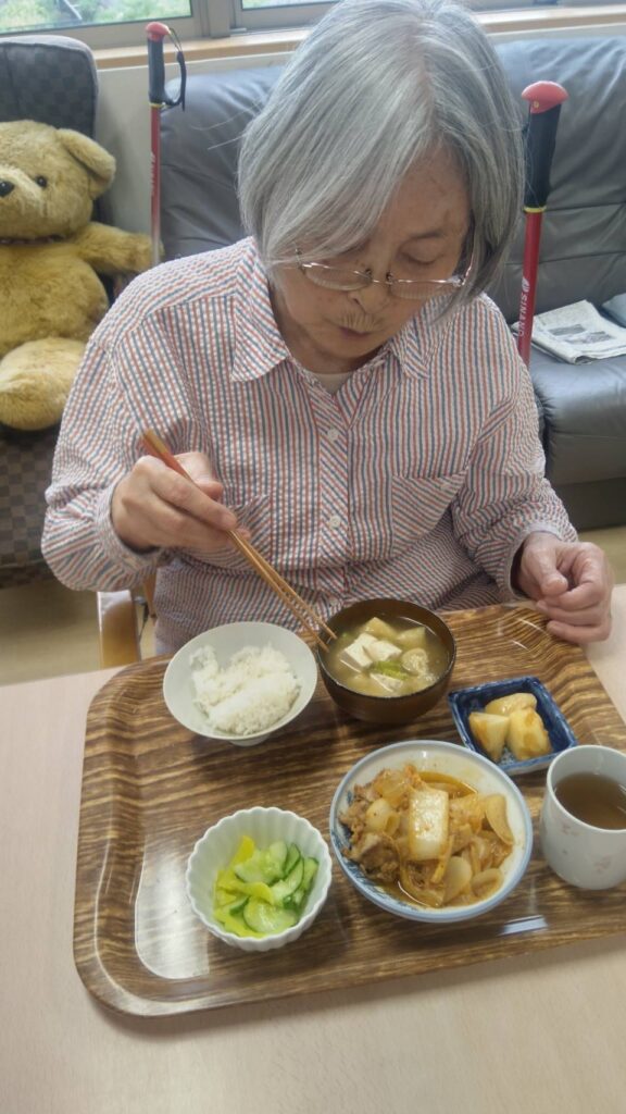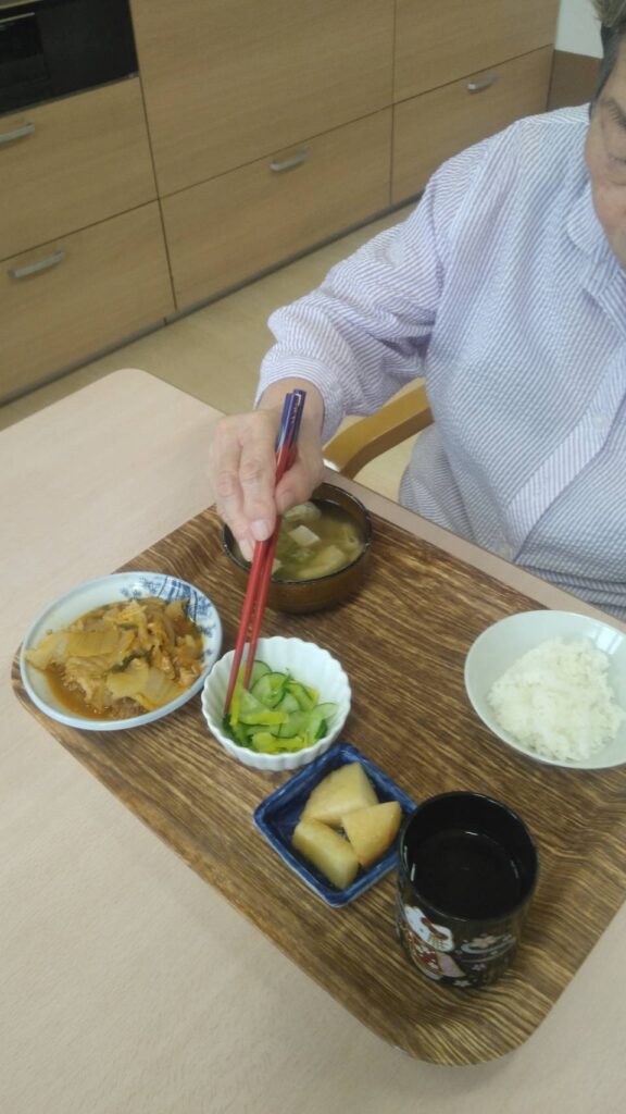 キムチ炒め・きゅうりと沢庵の漬物・味噌汁・桃(ありがとうございます)🥢