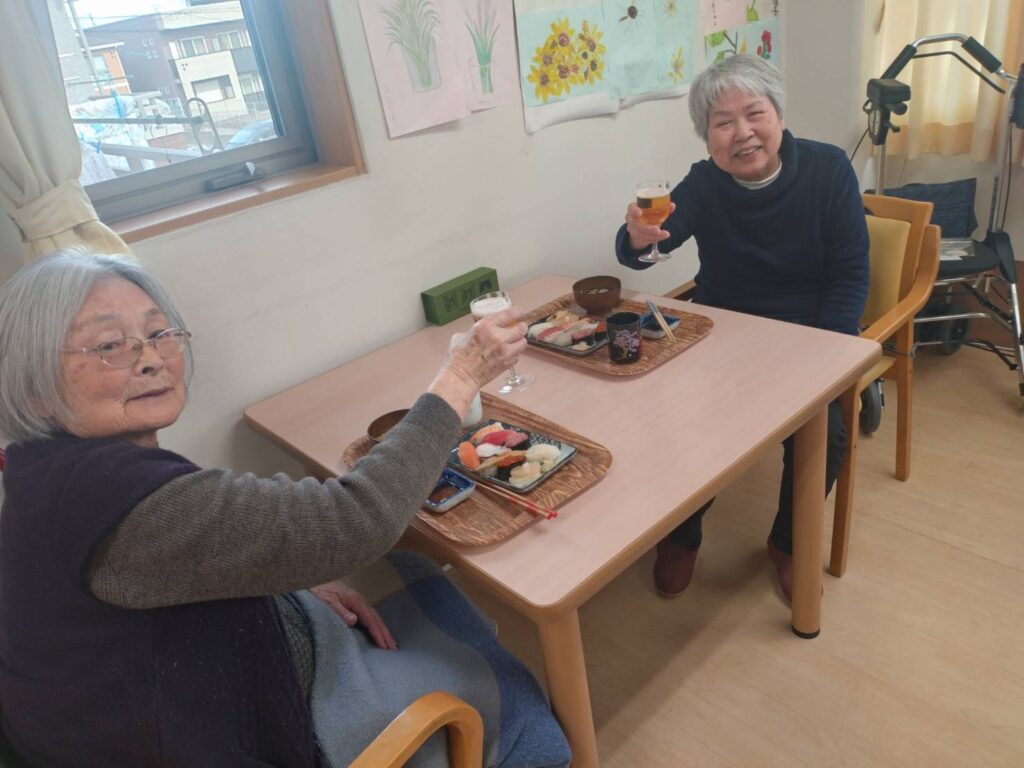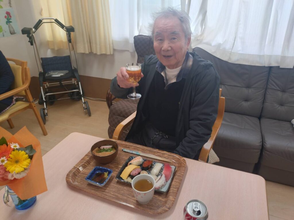 昼食は、お父さんがお好きな「握りずし・うどん」ノンアルコールビールで乾杯👏