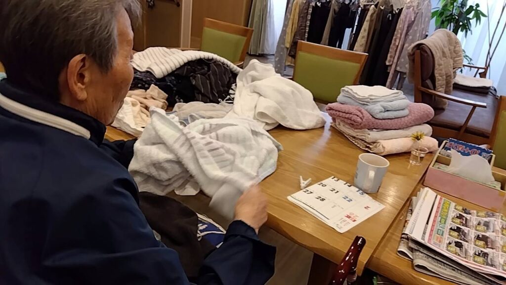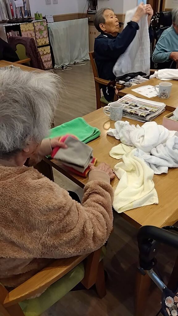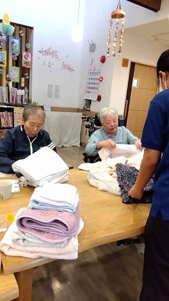 乾いた洗濯物を、みんなで協力してたたみます💪