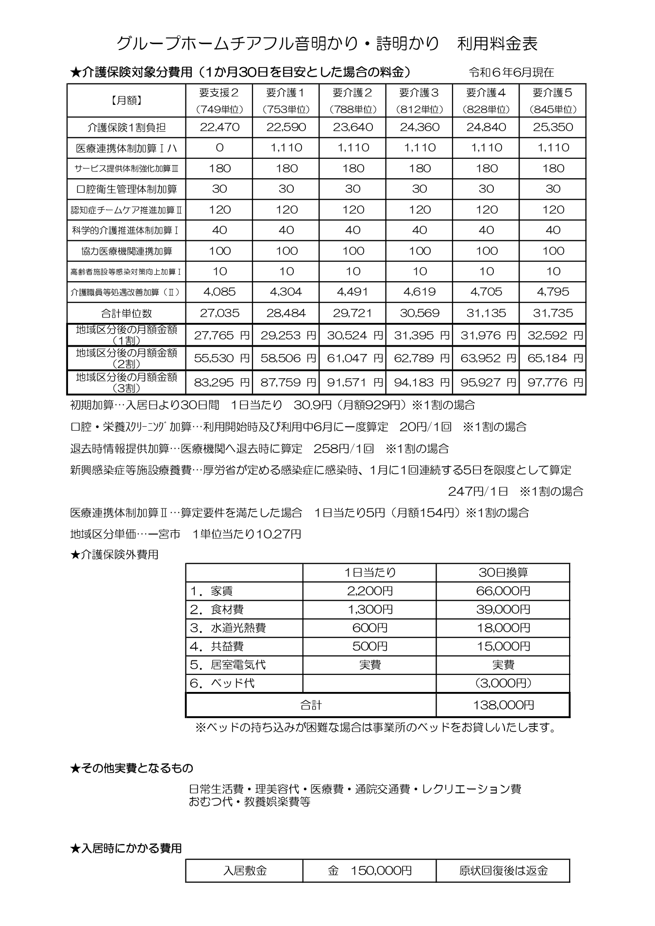 | 居室電気代 | 実費 | ベッド代 | 3,000円 |