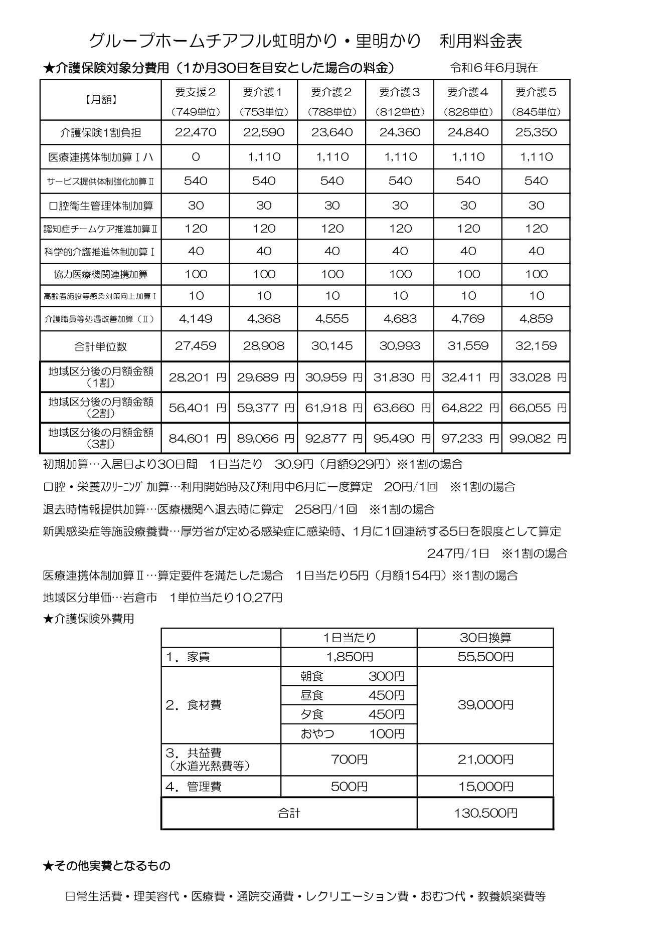 日常生活費、理美容代、医療費、通院交通費、レクリエーション費、おむつ代、教養娯楽費 等